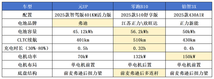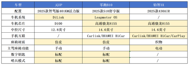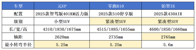 通过以上对比发现,三款车其实各有优势,比亚迪元UP在辅助驾驶能力方面突出,对预算不多,比较在乎辅助驾驶能力的用户值得考虑,但在空间续航上会牺牲很多;铂智3X在动力上占据上风,同时品牌有一定忠实粉丝,空间也比较不错,日常家用除了续航智能化表现一般,实用性挺好;零跑B10 510公里续航、高通骁龙8155芯片入门版得以配备,同时底盘后置后驱还是欧洲团队调教,驾乘体验上优于另外两台车,并且9万出头的裸车价格,整体表现属于挑不出明显短板,日常自己开操控灵活,家用空间实用配置续航都能满足,如果预算充足,对辅助驾驶有要求,那么高配激光雷达版也是可以冲的!