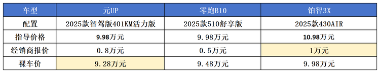 三款10万级新能源车型均有力度不等的经销商优惠,优惠后裸车价均下探至10万元以内,其中零跑B10 2025款 510舒享版额外赠送充电桩并享终身质保,性价比优势突出。