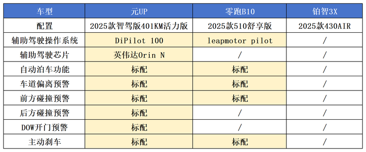辅助驾驶能力方面,由于铂智3X没有配备辅助驾驶系统,在辅助驾驶能力方面存在劣势,这也是合资车企的短板,辅助驾驶功能上有所欠缺,同时主动安全也没有涵盖,好在铂智3X在被动安全上,相另外两台车多了左右侧气帘。通过表格可以明显发现,元UP在辅助驾驶能力上比零跑B10略占优势,多出了自动变道和匝道自动驶入驶出以及召唤功能,日常高快速路会有一点帮助,但城区还不能实现该能力。
