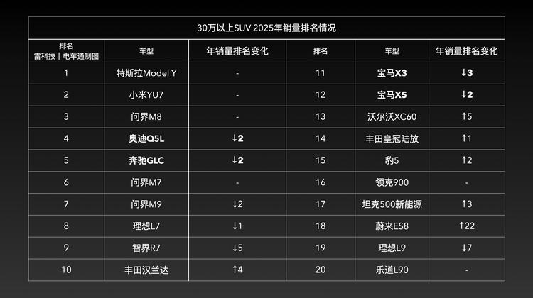 回看去年30万以上SUV战场:奥迪Q5L、奔驰GLC、宝马X3/X5这些老牌贵族节节败退;而对面,小米YU7、问界M8、 蔚来ES8(参数|询价)等新贵正集体冲高。