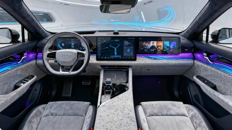 极氪8X的内饰设计围绕“未来豪华”与“智能交互”两大核心展开。其“环宇沉浸式座舱”采用横向贯通式超薄玻璃面板,将全液晶仪表、中控屏及副驾娱乐屏无缝集成,视觉上极大拉伸了座舱宽度。首次亮相的“星轨氛围灯系统”是交互创新的亮点——当用户语音唤醒导航时,灯带模拟星轨轨迹指引方向;播放音乐时,随节奏变换律动光影,让座舱变身太空舱般的科技空间。