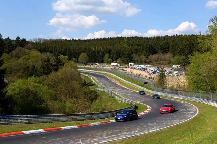 “大回旋”为纽北极具辨识度的弯道,经典的大角度下沉式回旋弯,内侧有30°倾角的混凝土斜坡,车手需以精准的油门控制通过这个倾斜弯道;“狐狸洞”又称“引力坟墓”,它的命名是传说因赛道修建时,有狐狸受惊躲进排水管而得名,满是传奇色彩。该弯道是纽北圈速与车手能力的关键分水岭,1.5公里的长距离陡坡下坡接连续左右快速变向,底部剧烈压缩后衔接陡坡上坡与高速左弯,最后接入Adenauer 森林路段,外侧紧贴悬崖,车道宽度从12米骤缩至7米,对悬挂的支撑性、回弹速度和车身刚性要求极高,悬挂调校不佳易失控;“阿德纳斯林”是纽北事故最多的弯道之一,包含多个盲弯和高低起伏;Flugplatz弯道为著名的“空中弯道”,因海拔急剧变化常使车辆“起飞”。