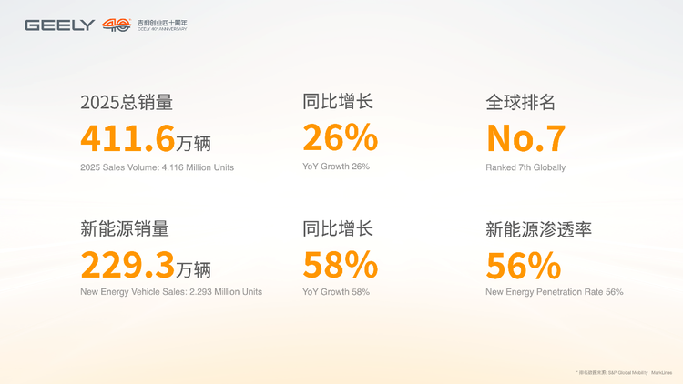 数据显示,2025年吉利控股总销量达411.6万辆,同比增长26%,实现年销量首次突破400万辆,且连续五年保持正增长,在全球车企年度销量排名中位列第七;其中,新能源汽车销量229.3万辆,同比增长58%,新能源渗透率达56%。