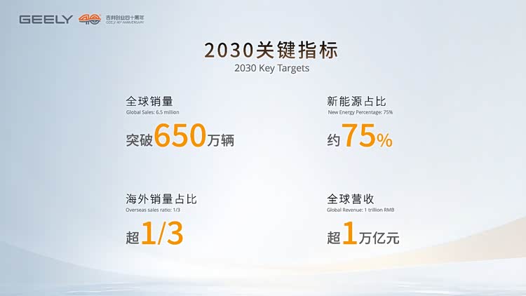 按照战略规划,吉利控股2030年将实现全球总销量(含乘用车与商用车)突破650万辆,营收超1万亿元;其中新能源汽车销量占比约75%,海外市场销量占比超三分之一。同时,吉利控股将开发覆盖A到E级车型的全球顶级新能源架构,并基于该架构实现单车型平均研发周期和综合成本下降30%以上。
