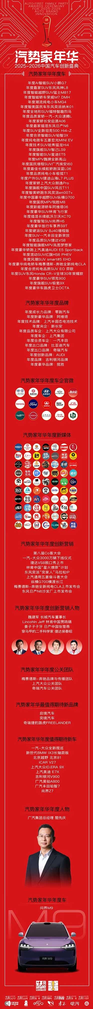 正是基于对产业深刻变革的洞察,本届汽势家年华的奖项评选体系科学而多元,完成了一次从“车”到“人”、从“前台”到“幕后”的完整呈现。评选历经市场表现调研、专业评测、专家与消费者投票等多重环节,旨在从年度车、年度车企、年度品牌、年度营销、年度车企官微、年度创新营销达人、年度公关团队,以及车企社会责任ESG年度金钥匙、年度新媒体和2026年最值得期待新车、新品牌等多个维度,褒奖中国汽车行业的2025的沉甸甸,以及2026年的未来可期。