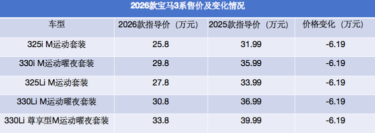 1月23日,宝马中国官方宣布,2026款 宝马3系(参数|询价)现已正式上市,共推出5款车型,官方指导价25.8万-33.8万元。2026款宝马3系全系定价下调6.19万元,功能配置同步增加,动力方面仍搭载两种功率调校的2.0T涡轮增压发动机。