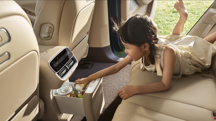 配置上侧重家庭实用性,标配四区独立空调、后排座椅电动调节,纯电 Ultra 版还可选装空气悬挂,前排座椅加热 / 通风按需选装,后排侧气囊的配备也体现了对家庭乘员的防护细节。储物空间设计合理,中控台下方的贯通式储物格、门板储物格等能满足日常小物件收纳,冷暖箱的配置更是贴心,能随时提供温水,对老人小孩都很友好。