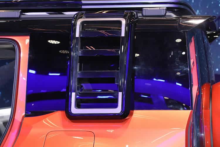 从侧后方向来看,银河战舰除了带有环带与装甲装饰的外挂装置外,其顶端布局的赛车式扰流板会让我想起梅赛德斯-AMG所打造的奔驰G级,不管它对车辆动态操控改善有几分效果,反正视觉上还是挺唬人的。另外,车辆还布局了纵向尾灯,它不光出现在了后风挡支柱中,也几乎完成了整个D柱侧后的贯穿,这点亮后的视觉辨识度自然是不用多说。