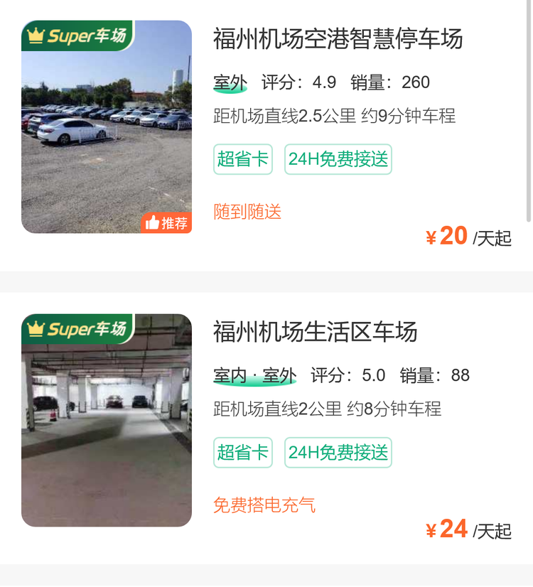 机场外附近停车场:机场外的停车场单日收费较低,一天收费价格大概在15到25左右,不过,收费单位通常是24小时或者一天,更加适合停车时间较长的旅客,而且停车场会有免费接驳的服务,还上线了平台,通过淘车位小程序就可以预订。