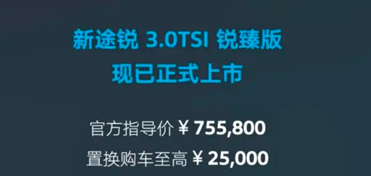 车家号·0浏览·2026-01-23 17:20 · 广东日前,我们从大众汽车官方获悉,新款大众途锐3.0TSI锐臻版现已在中国市场正式上市,指导价75.58万元。作为大众品牌旗下的中大型SUV,大众途锐全系以进口形式引入,整体售价区间为50.88万-79.38万元。
