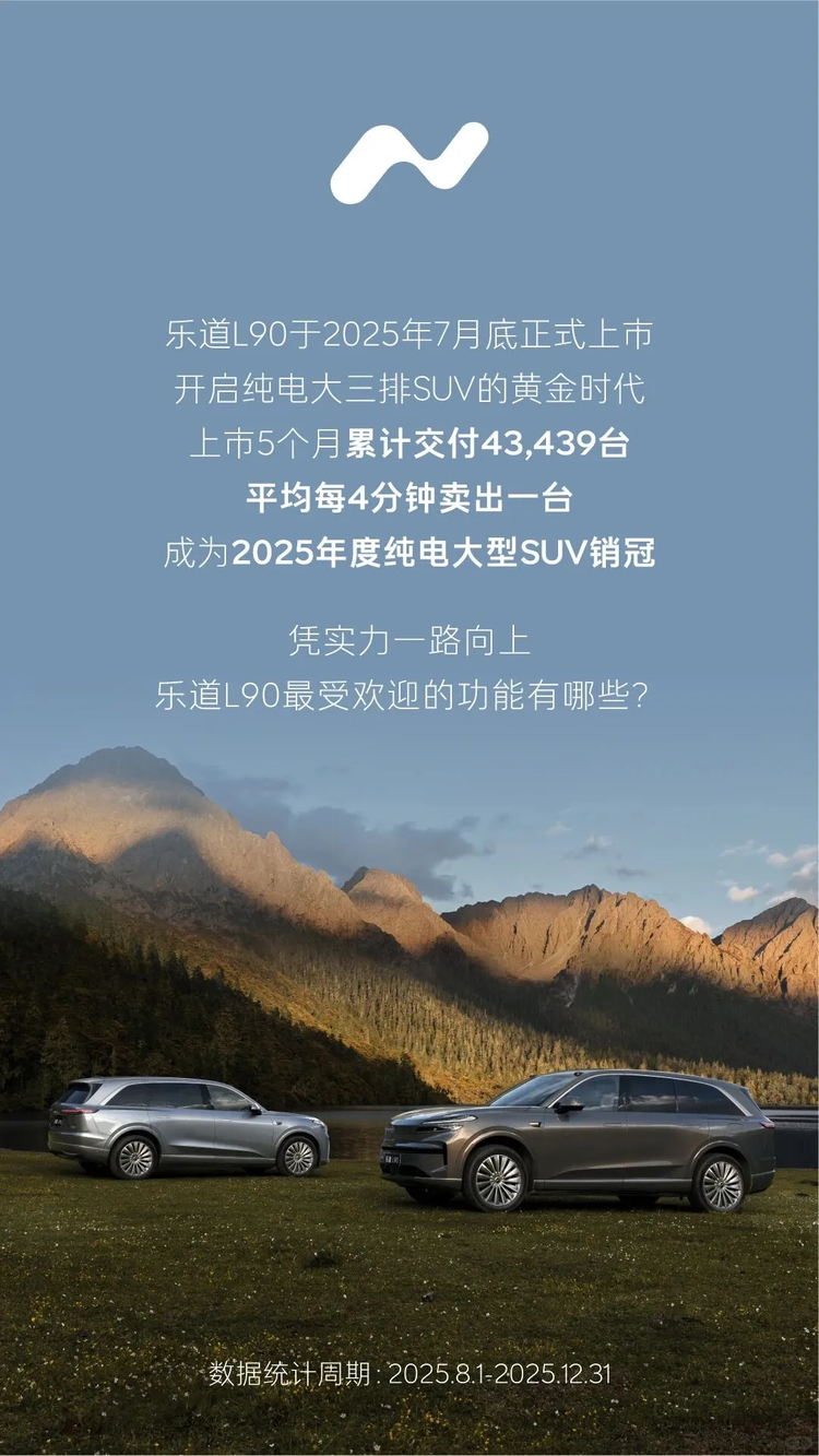 2025年已成过去式,回望这一年,中国汽车市场正经历一场深刻的能源结构变革。在“双碳”目标持续推进、补能基础设施日益完善的大背景下,纯电车型尤其是大三排SUV细分市场迎来爆发拐点。数据显示,2025年9月至12月,纯电大三排SUV销量连续四个月超越增程、插混及燃油竞品,标志着增程大三排SUV的黄金时代已然落幕,而属于纯电大三排SUV的黄金时代正加速到来。在这场结构性变革中,乐道L90以上市5个月交付4.3万台的成绩,强势登顶2025年纯电大型SUV销量冠军,成为行业转型的标志性产品。