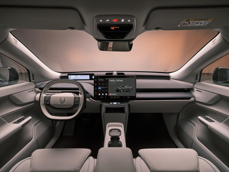 进入车内,EX60的内饰设计与EX30和EX90略有不同,整体并未追求极端简化。它的中控屏幕采用横向设置而非过去的直立式,仪表台中央并未设置传统冷气出风口,左右两侧则采用狭长的隐藏式设计。