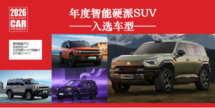 年度智能硬派SUV有四款车型入围:福特智趣烈马、全新坦克400、北京越野BJ40元境智行、东风猛士M817。硬派越野车拥抱高阶智驾是2025年新上市的诸多硬派越野车型的一大特点。地今年的年度智能座驾的线下评测中,采用华为乾崑智驾ADS 4的东风猛士M817在70多公里的多场景路况中做到了零接管。