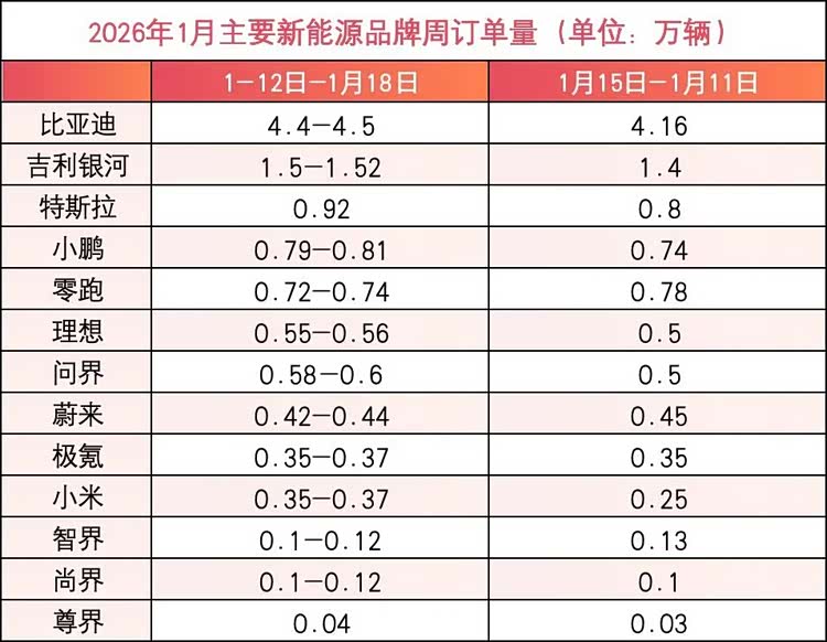 除了上述造车新势力外,摩根士丹利统计了几个国内头部的电车品牌,以及传统车企新品牌的订单表现。其中,比亚迪上周订单为4.4万—4.5万辆,较前一周增长了约0.24万辆,稳居榜首。近期,比亚迪以“插混纯电长续航”为卖点,开启2026年的产品攻势。