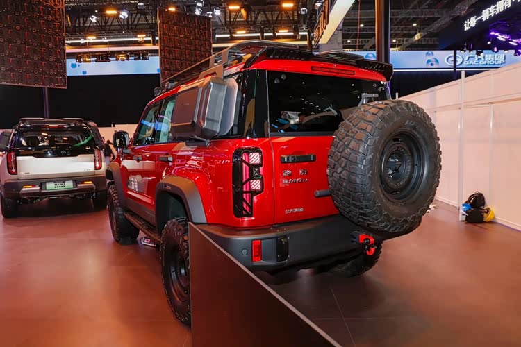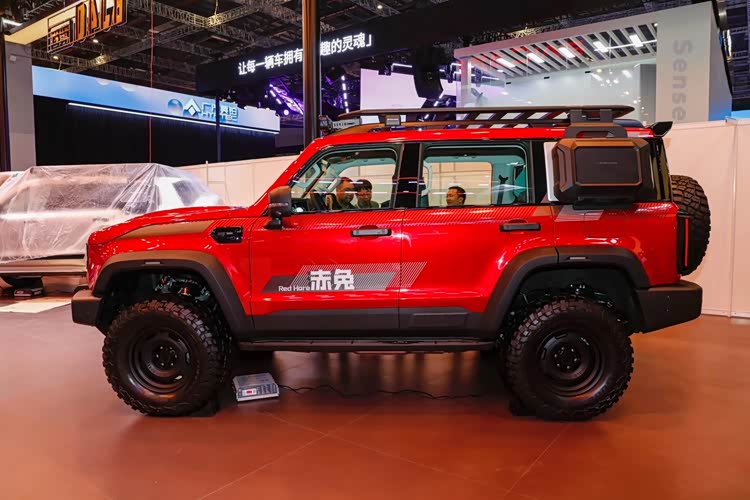 结合实车来看,北京越野BJ40增程赤兔版延续家族化设计,“方盒子”造型车身配搭宽厚粗犷的车身包围套件,硬派SUV的属性得到直观呈现。在此基础上,北京越野BJ40增程赤兔版采用红色车身涂装,提供顶灯、高进气量涉水喉、车顶置物平台等外观装备。