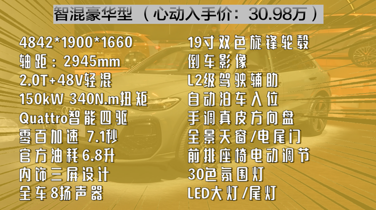 那哪个配置值得优先考虑,咱一个一个来看!先看入门的智混豪华型,车长4842mm,轴距2945mm,相对老款,数据略有提升,不过依旧是中型SUV的定位。全系标配第五代 EA888发动机,两款低配是150kW的功率,比老款提升了10kW,而且有了48V轻混系统的加入。