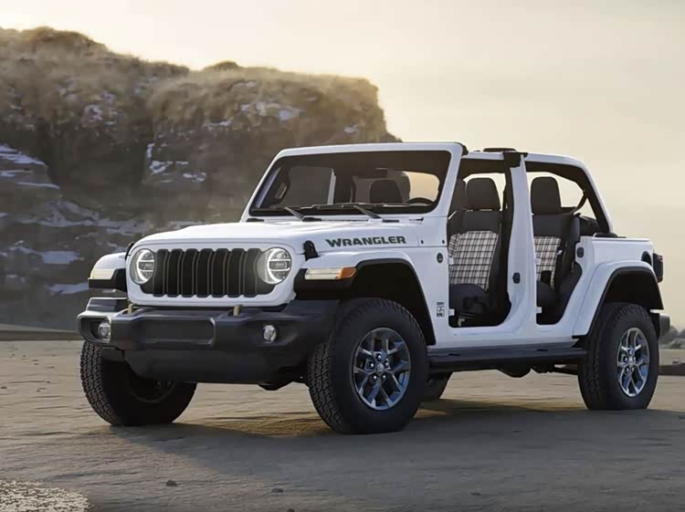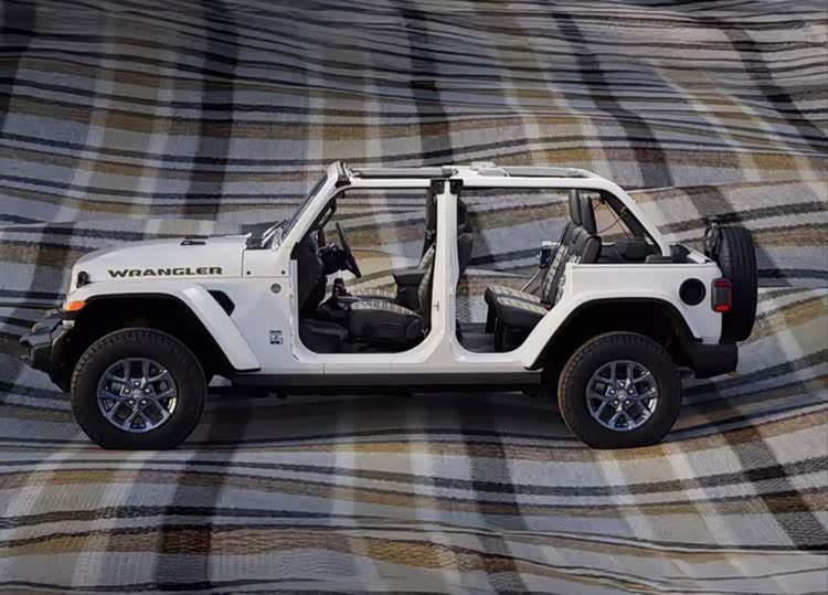 外观上,新车延续牧马人经典方盒子造型,核心升级集中在专属标识与细节配色。前脸部分,发动机舱盖两侧配有wrangler字母标识,字体采用复古风格设计,成为纪念版车型的标志性元素,与车头七孔格栅形成呼应,强化品牌辨识度。车顶提供黑色或车身同色双选项,满足个性化需求。