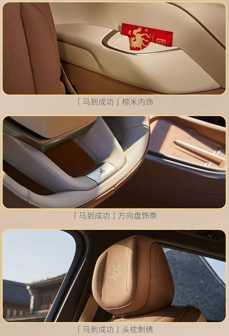 车内采用六座布局,重点强调家庭使用场景,车内采用了棕米双色的Nappa真皮内饰。前排头枕上绣有“马到成功”字样,方向盘饰条和车机系统界面也更新为专属主题风格,车辆还新增了马啸声效作为锁车提示音。