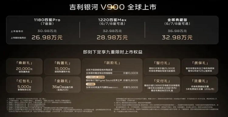 车评社讯1月20日,吉利 银河V900(参数|询价)正式上市,新车共推出3款车型,上市限时指导价26.98万元-32.98万元。从产品划分来看,吉利银河V900属于吉利银河V系列首款旗舰车型,该车定位为“AI全场景家庭旗舰MPV,可见家庭及商务是兼具的,那么这款车实力究竟如何?