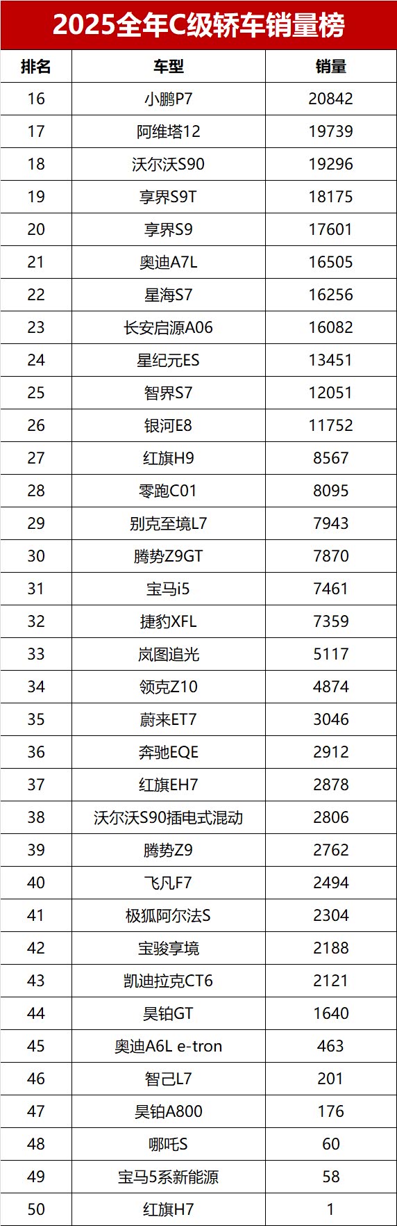 在过去多年,国内C级轿车市场一直是豪华品牌的主场,奥迪A6L、奔驰E级、 宝马5系(参数|询价)常年垄断头部位置。但随着自主品牌新能源车型的强势崛起,C级车市场格局被彻底打破,新能源车型与传统豪华燃油车的较量成为主流。乘联会数据显示,2025年全年国内C级轿车市场零售销量达到84.5万辆,同比增长13.6%,远高于轿车市场3.8%的同比涨幅,在乘用车市场的份额达到3.6%,成为车市中增速亮眼的细分领域。炸裂!2025全年C级轿车销量榜,冠军25.8万辆,宝马5系仅第五!
