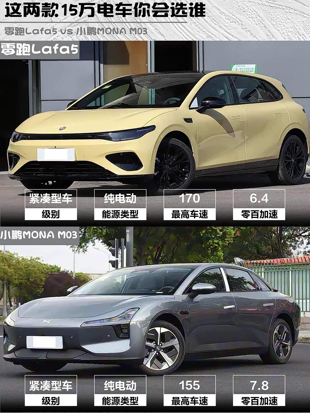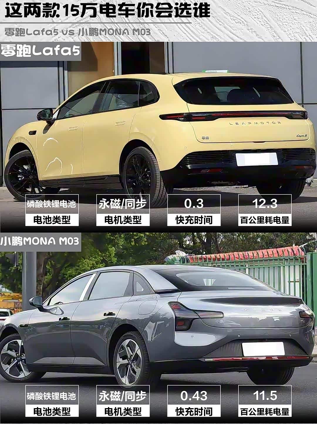要操控个性选零跑Lafa5,要智能省心选小鹏MONA M03。我自己最后选了零跑,毕竟省下的钱够改个黑武士套件+三年电费了!你们会pick哪款?评论区见~