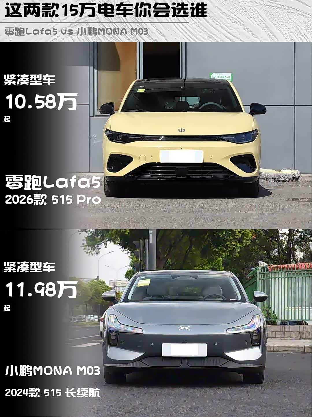 最近在选15万级纯电轿车的小伙伴看过来!今天深度对比两款热门选手——零跑Lafa5 2026款 515 Pro和 小鹏MONA M03(参数|询价) 2024款 515长续航,看完这篇你就知道谁更香了🔥