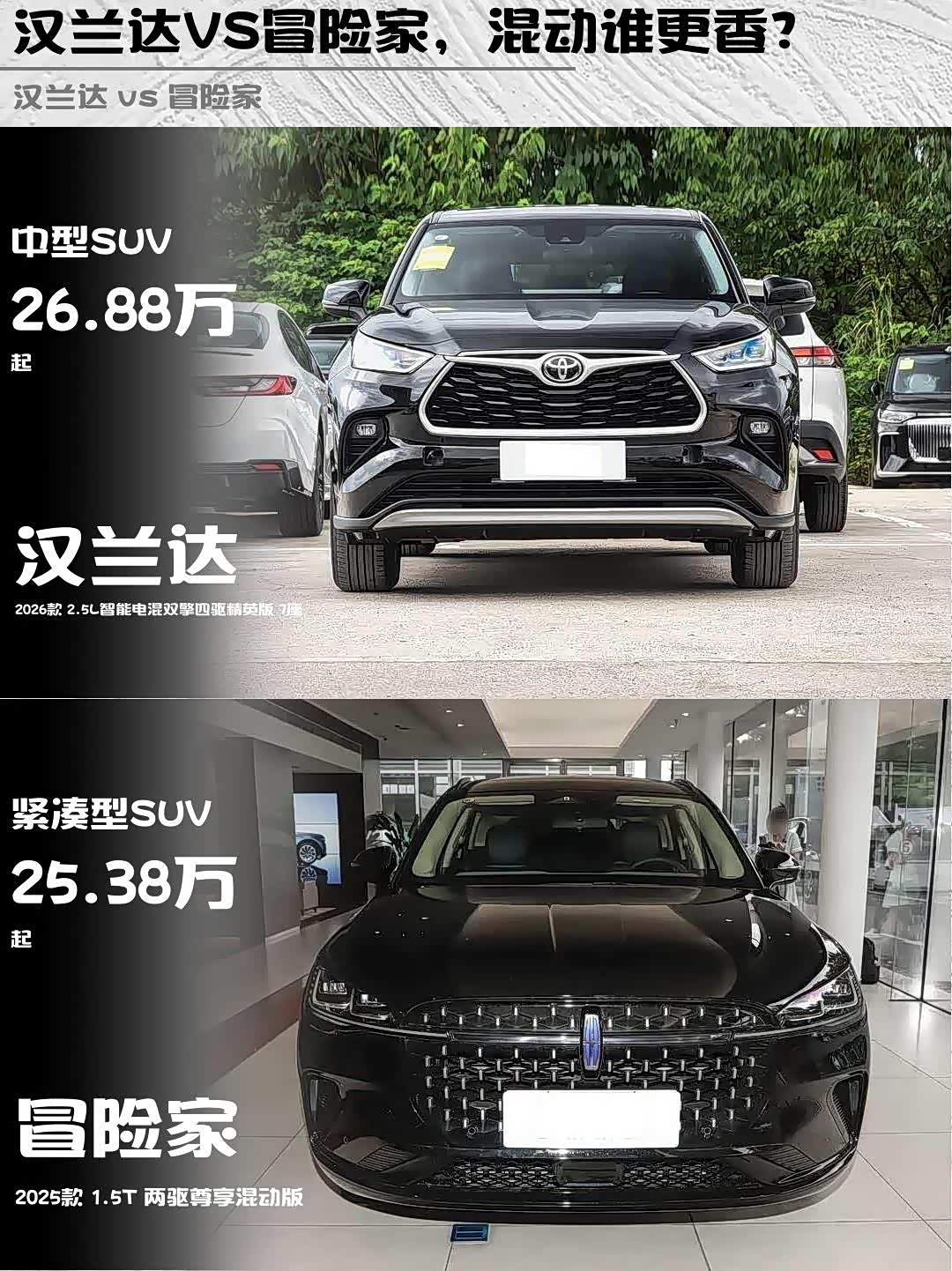 先看硬核数据:2026款汉兰达2.5L智能电混双擎四驱精英版7座 vs 2025款冒险家1.5T两驱尊享混动版,差价1.5万到底值不值?