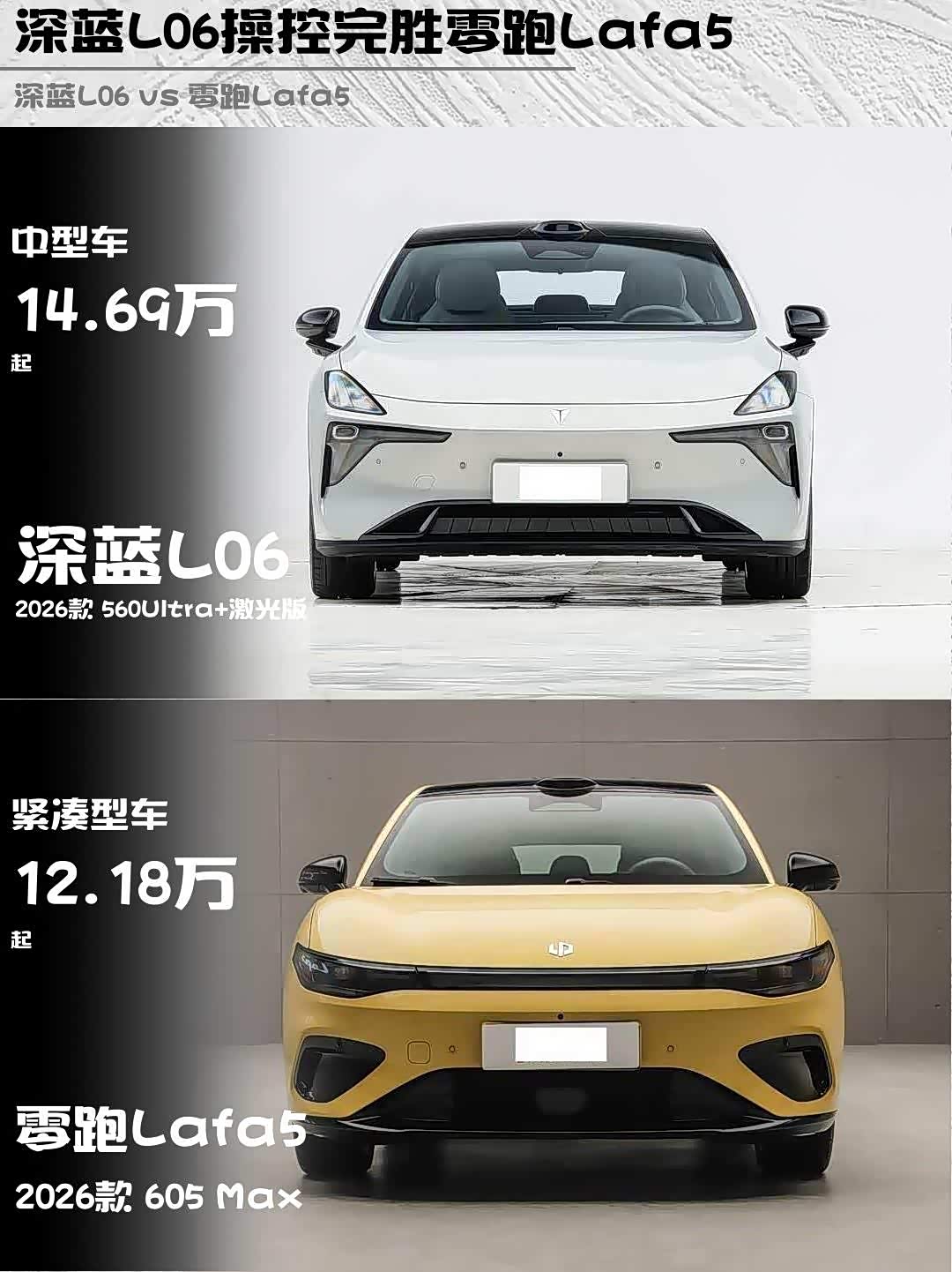 车家号·0浏览·2026-01-25 08:50 · 北京最近试驾了两款15万级纯电轿跑——深蓝L06 2026款 560Ultra+激光版和 零跑Lafa5(参数|询价) 2026款 605 Max,作为同价位段的热门选手,实测对比后发现了不少有意思的差异点🔥