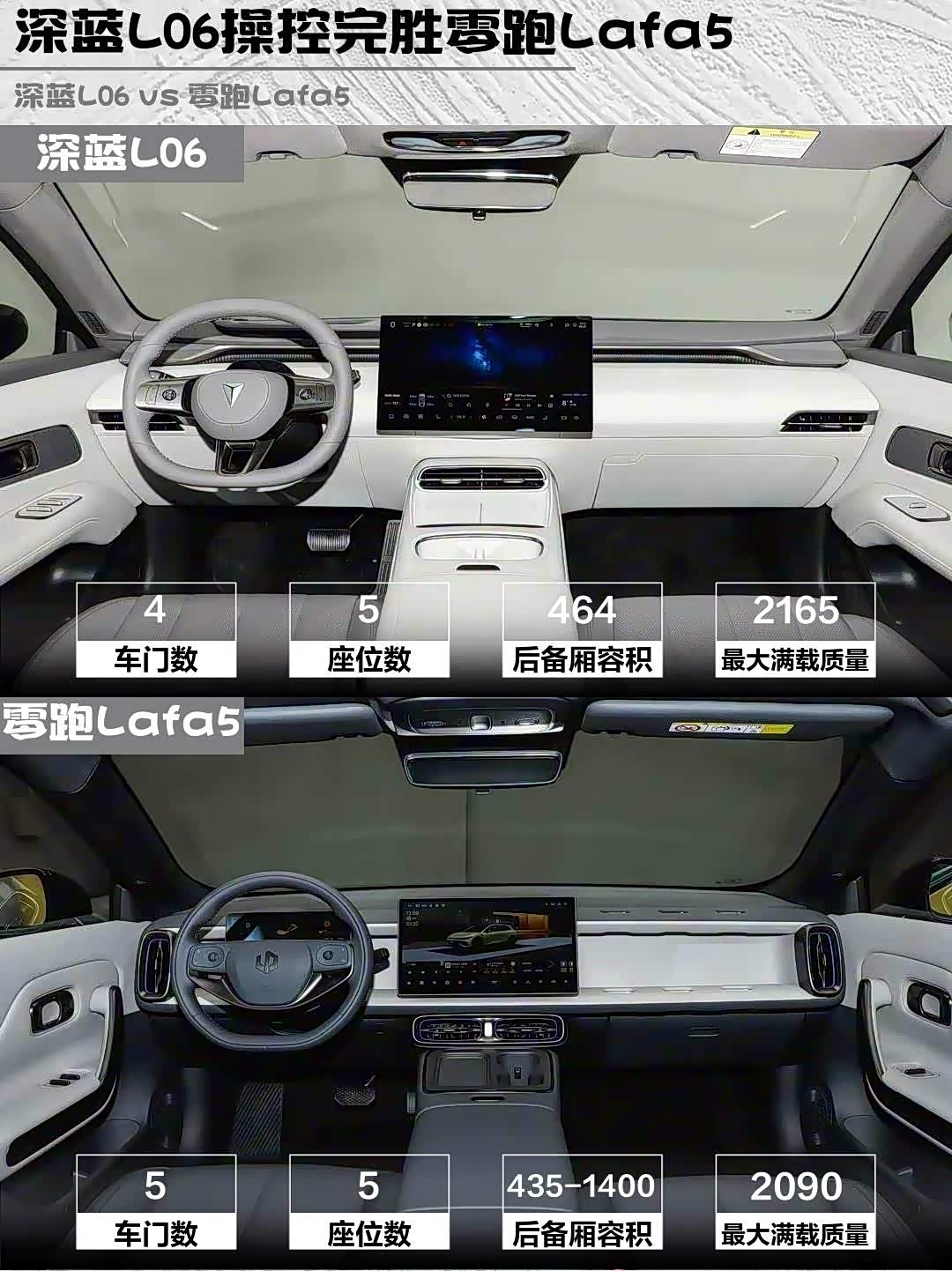 深蓝L06的2900mm轴距后排能跷二郎腿,464L后备箱+前备箱组合实用度拉满。零跑Lafa5虽然尺寸小一号,但掀背尾门+魔术岛台设计很讨巧,放倒后排能塞进两辆公路车🚴 不过深蓝的零重力副驾带按摩,午休体验完胜!