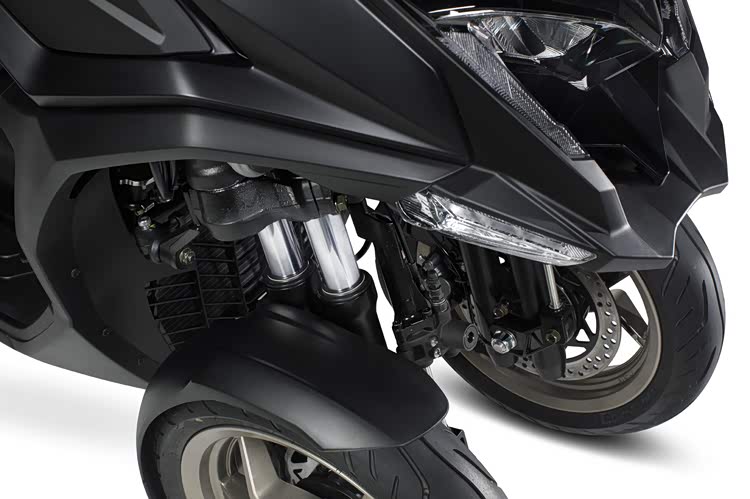 而在悬挂系统方面,它采用了光阳自主研发的KALS前轮倾斜悬挂系统,通过四根平行四边形合金连杆,使两个前轮能够实现最大40度的倾斜角度。