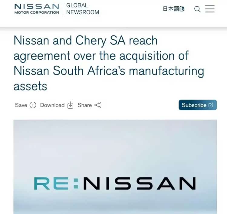 这事就发生在前两天的1月23日。日产和奇瑞南非公司正式官宣:奇瑞接手日产位于南非比勒陀利亚罗斯林的整车工厂,包括土地、厂房和附近的冲压设备。虽然具体成交价没公布,但业内普遍认为,这是一笔“清仓甩卖”式的交易。