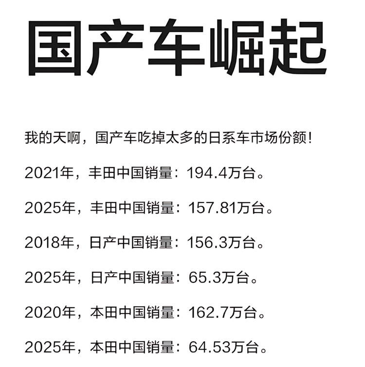 至于日产?它自己也不得不承认:在南非继续卖车、做售后没问题,但造车这事儿,实在撑不下去了。全球销量连年下滑,除了丰田还能硬扛,本田、日产的日子都不好过。有网友翻出对比图:2021年到2025年,日系三强中,只有丰田勉强稳住,本田和日产销量直接腰斩再腰斩,只剩个零头。