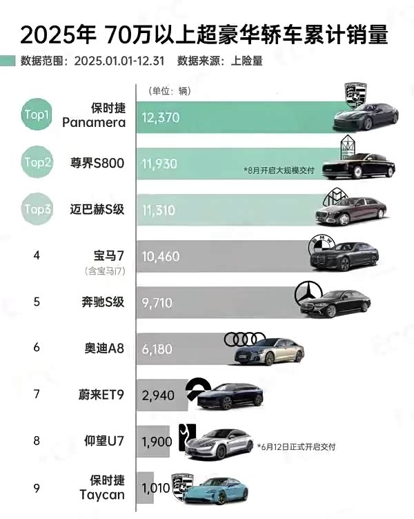 2025年70万以上超豪华轿车累计销量排行榜公布,万万没想到保时捷帕拉梅拉成了最大赢家,百万起步的轿跑,销量居然能碾压78S,确实很不可思议,因为在过去,78S迈巴赫是该价位段的销量王者,一个能打的都没有。