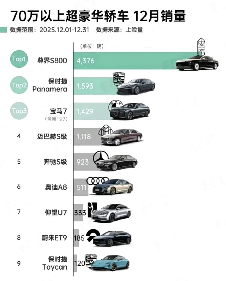 现在尊界工厂的产能快速提升,上个月S800销量破天荒的高达4376台,断崖式领先所有超豪华轿车。可能很多人还不知道这个月销量意味着什么,这么说吧,12月份,78S迈巴赫以及保时捷taycan五款车销量加起来,还比不过尊界S800,这就是赤裸裸的差距,百万豪车市场俨然已经变天。