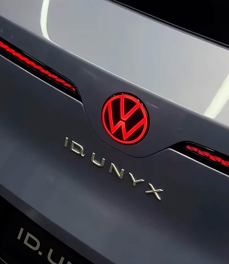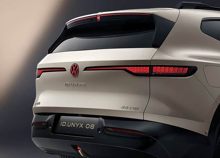 绕到车屁股后面,那个红色的发光尾标下面是一排金色的ID.UNYX字母。最有意思的是那个高位刹车灯,居然做成了狼堡的狼标形状。