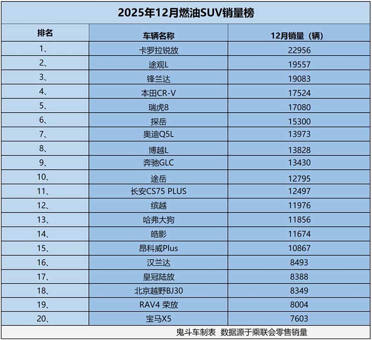 口说无凭,销量数据更有说服力。近日,乘联会发布2025年12月零售销量数据,鬼哥整理出2025年12月燃油SUV销量排名前二十榜单,结果发现,榜单上共有15款车型销量过万,接下来,看看具体排名与销量表现。