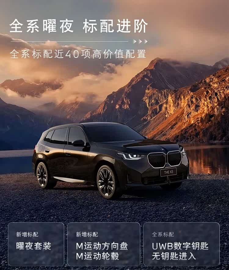 而新款宝马X3则是给入门车型换上了曜夜套装+M运动方向盘+M运动轮毂,低功率版本也能看着很运动。