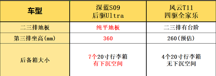通过对比不难看出,如果只是日常通勤,两台车都能完成基本任务。至于说怎么选,就看各自的用车需求了。风云T11的整体水平都很不错,各个方面都稳扎稳打,是一台标准的大六座家用大型SUV。但是放到春节返乡,这种会高频长途的用车场景中,在同价位的深蓝S09身上,能看到更多贴合家庭用户的细节设计。