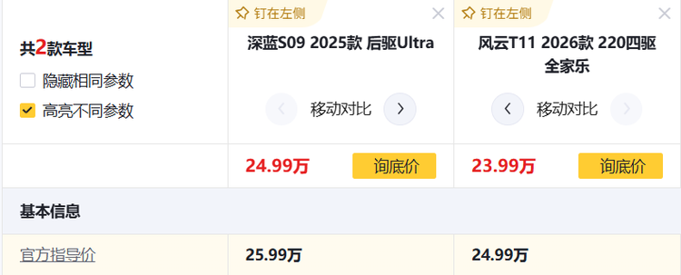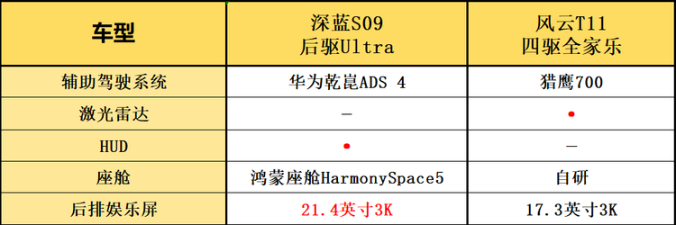 为了直观呈现二者的产品差异,我们选取了指导价为25.99万元的深蓝S09 2025款 后驱Ultra(下文简称:深蓝S09),以及指导价为24.99万元的风云T11 2026款 四驱全家乐(下文简称:风云T11)来做一个对比。在长途返乡这种使用场景下,谁会更从容、更让人安心?一起来看一下。