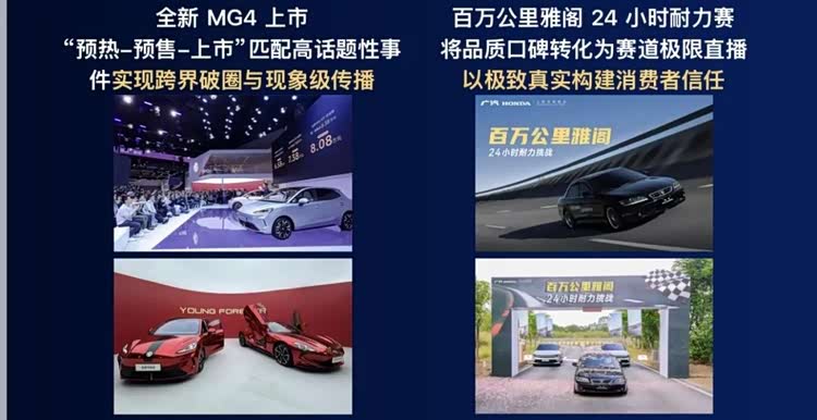 不管是极石上市之后重走丝绸之路,还是享界S9T告别“发布会即高潮”,多次和用户场景做沟通;或者是华为的乾崑和广汽启境的上市,从品牌产品渠道集中做整合营销;或者铂智3X上市,后续娱乐化、场景化的体验,包括全新MG4的上市跨界营销,以及包括雅阁百万公里24小时耐力赛,实际上都是在告诉我们,今天上市只是一个和用户关系的开始。