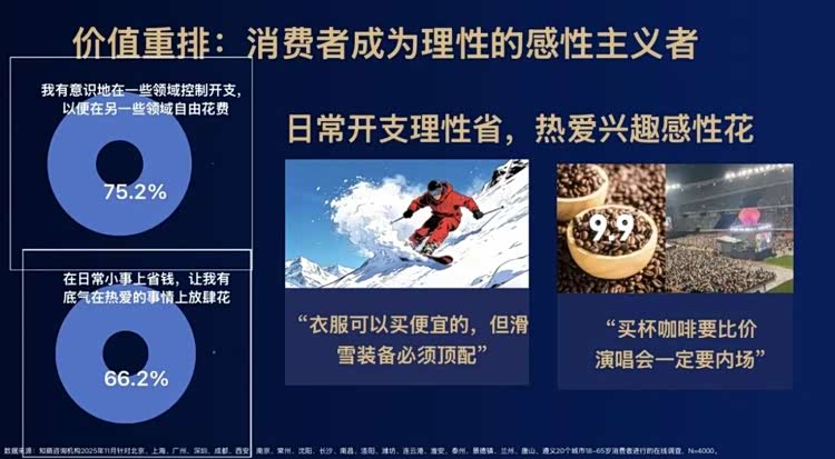 今天不仅是价值的重排,更是消费者账户的迁徙。有很多的例子,衣服可以买便宜的,但滑雪装备必须是顶配;买一杯咖啡要比价,但买演唱会一定要内场……我们今天所看到的整个变化是什么?今天消费者成为了一个理性的感性主义者。