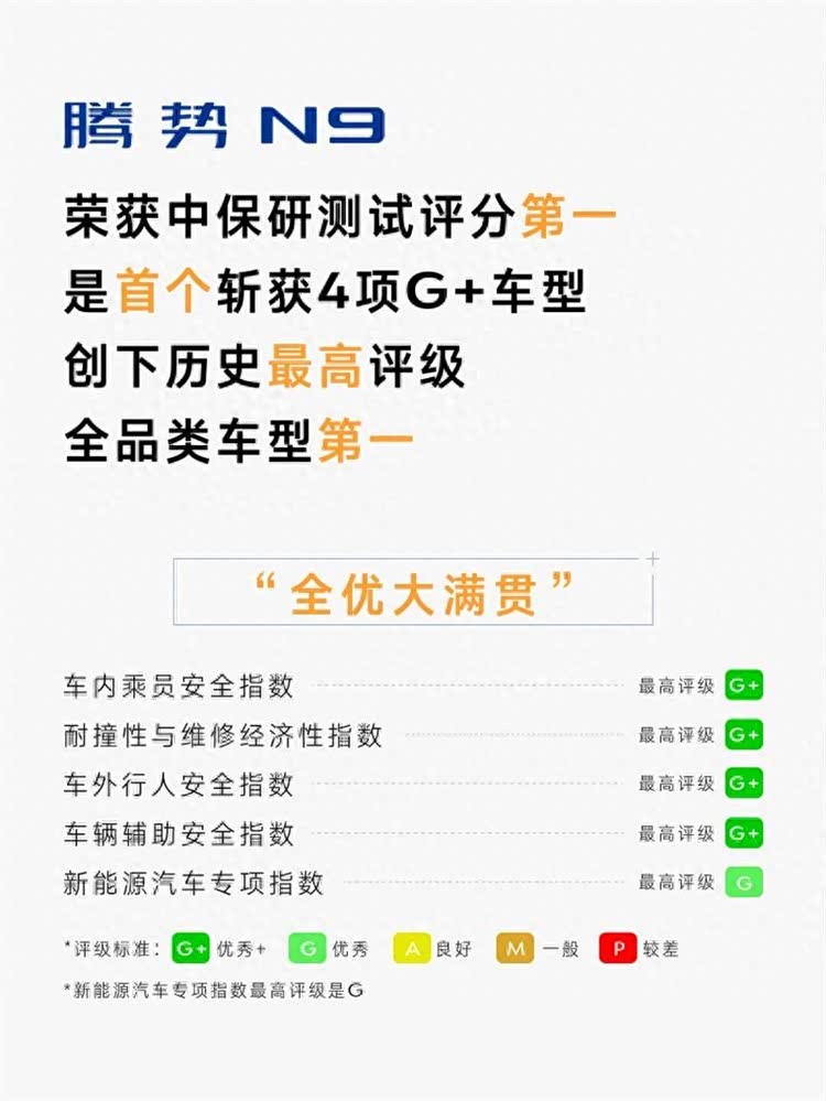 腾势N9在车内乘员安全指数、耐撞性与维修经济性指数、车外行人安全指数、车辆辅助安全指数四大核心分指数中均斩获最高等级G+评级,新能源汽车专项指数获G评级,全维度卓越安全成绩。在中国保险汽车安全指数C-IASI测试成绩中,腾势N9实现全优大满贯!是名副其实的安全之王。