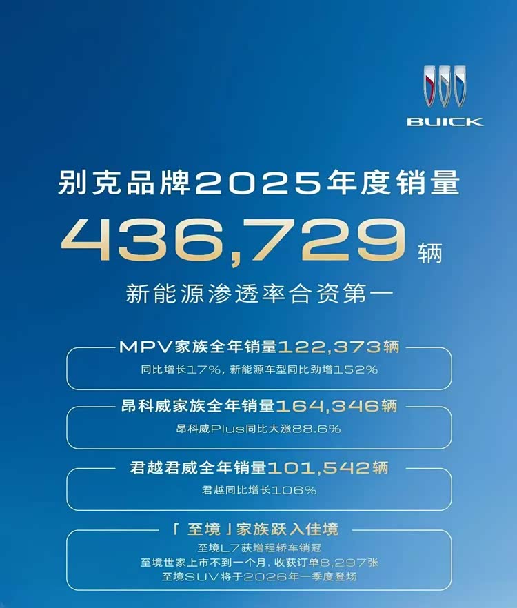 需要指出的是,2025年上汽通用别克全年销量达436729辆,多款核心车型表现抢眼。其中,昂科威家族以164346辆稳居销量主力, 昂科威Plus(参数|询价)同比大涨88.6%,家族累计产销超190万辆。MPV家族全年销122373辆、同比增17%,新能源矩阵占比超50%,同比激增152%,新晋上市的GL8 陆尚上市不足半年产量破5万辆,强势拉升品牌新能源MPV市场声量。此外,君越、君威合计销量破10万辆,君越同比翻倍增长,产品焕新成效显著,别克在燃油与新能源赛道均实现稳步突破。