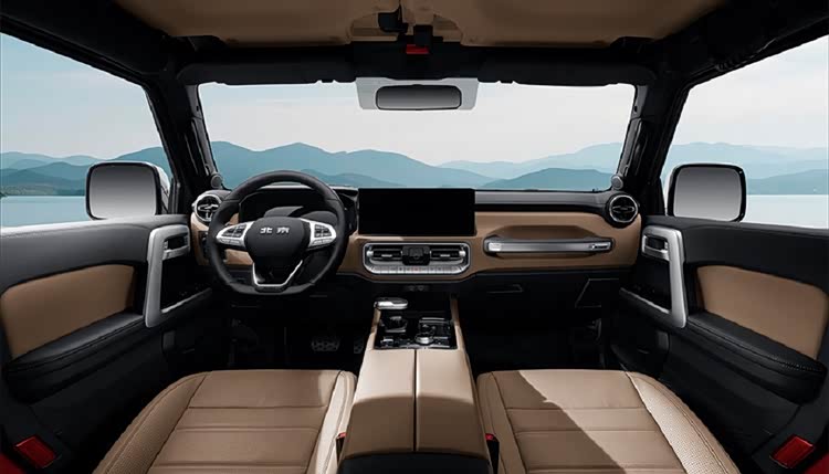 内饰和配置是两款车的“性格分水岭”,北京越野BJ40探险家主打“实用主义”,车内布局规整,15.6英寸英寸悬浮式大屏,内置8155芯片操作流畅不卡顿,能轻松应对各种复杂指令,大量实体按键的保留让驾驶者在越野过程中能更便捷地进行操作;前排座椅加热/通风都配齐了,为驾乘人员提供舒适的乘坐体验。
