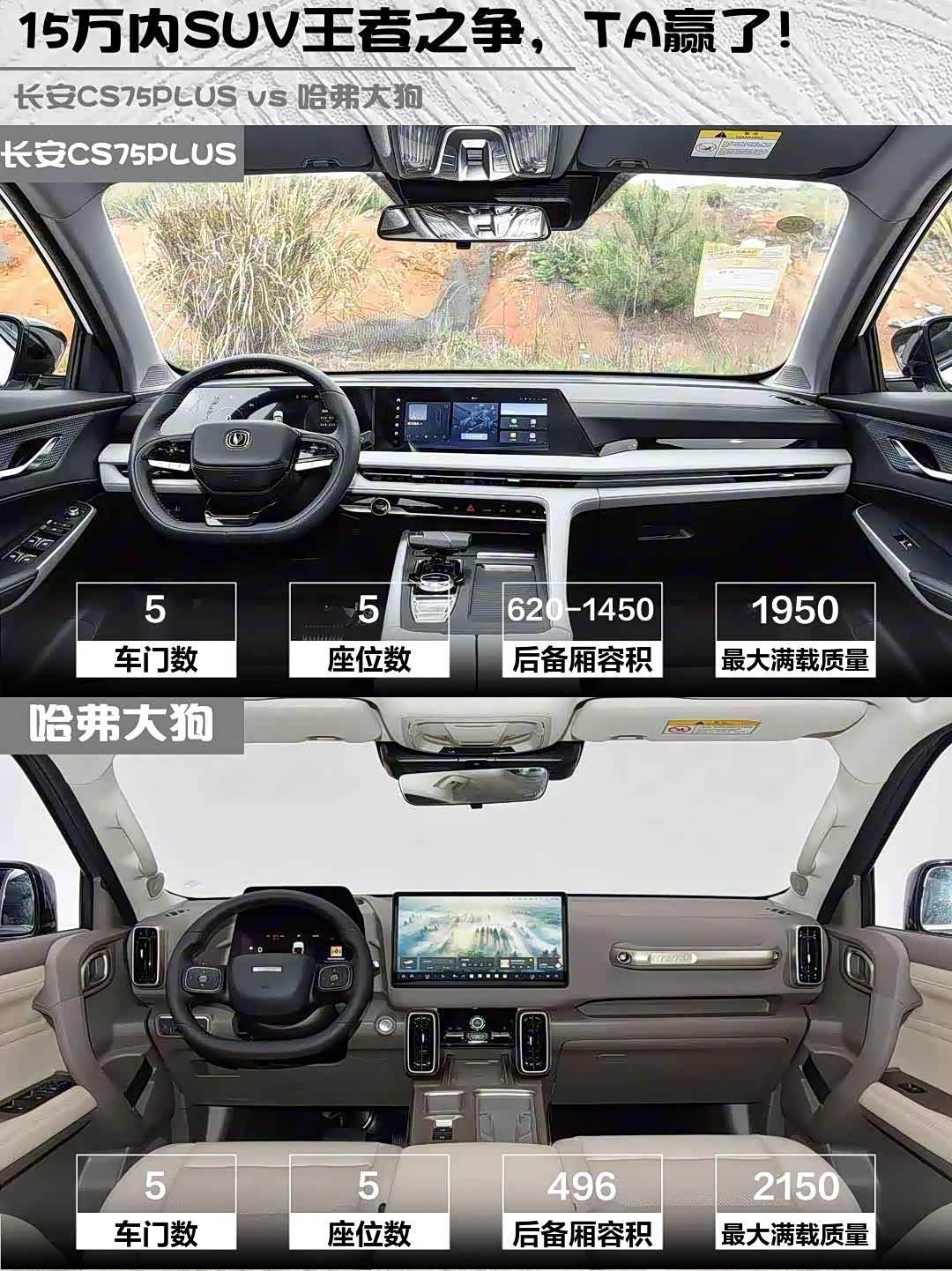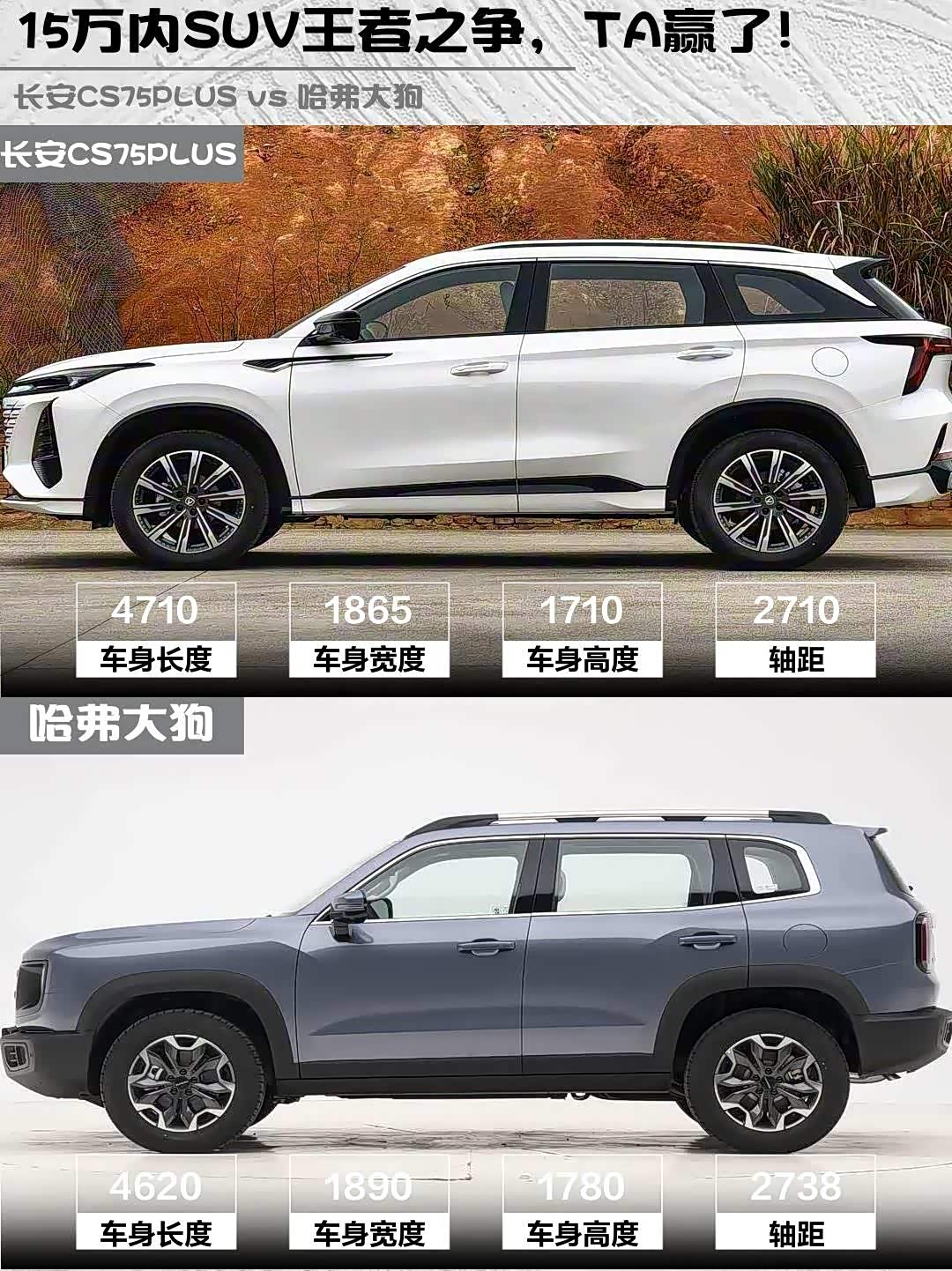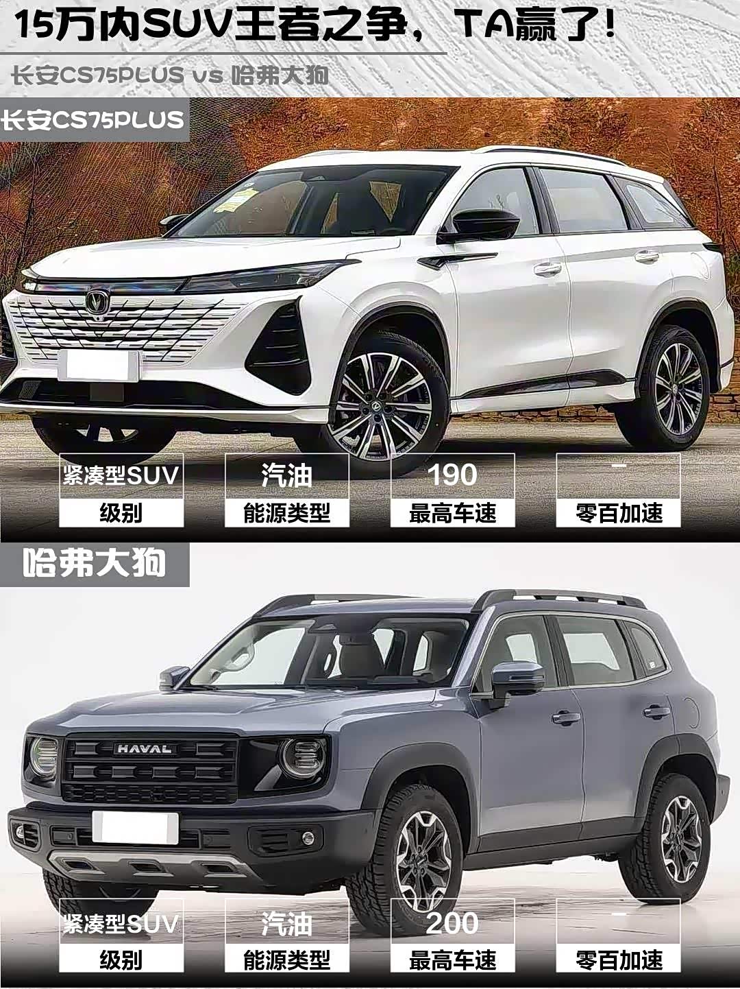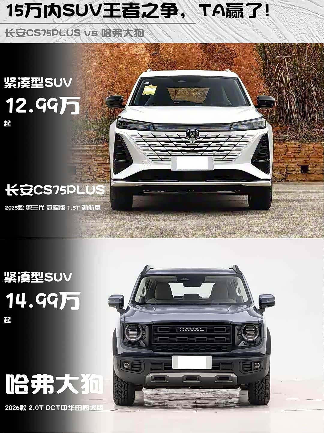 最近在选15万级SUV的朋友看过来!今天深度对比两款热门选手—— 长安CS75PLUS(参数|询价) 2025款第三代冠军版1.5T劲航型(12.99万)和哈弗大狗2026款2.0T中华田园犬版(14.99万),实测干货直接上!🚗💨