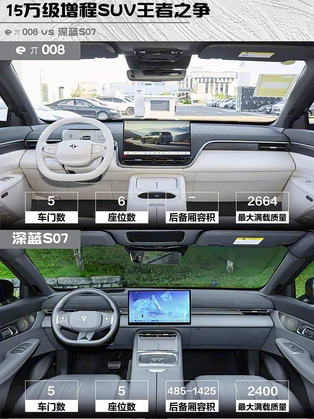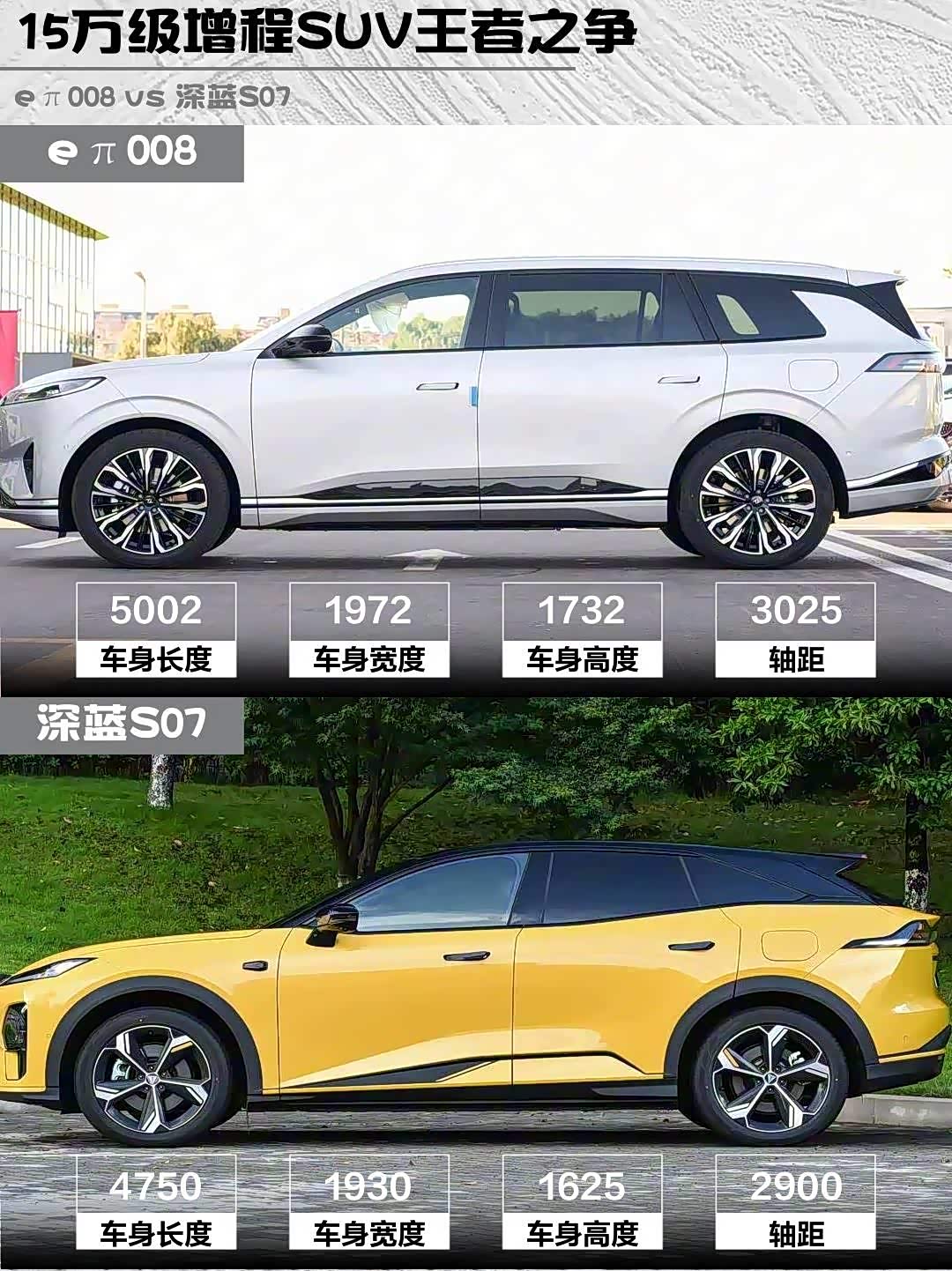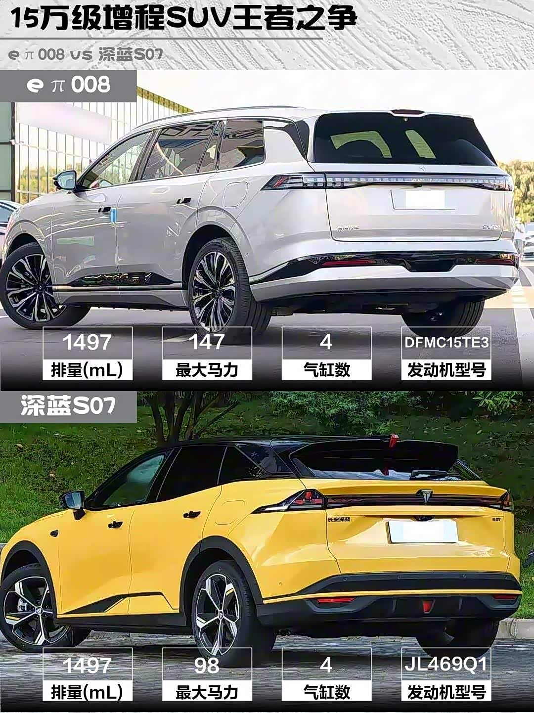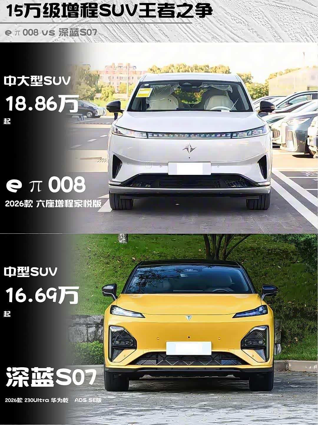 最近在选家用新能源SUV的朋友看过来!今天深度对比两款热门增程车型——eπ008 2026款六座增程家悦版 vs 深蓝S07(参数|询价) 2026款230Ultra华为乾崑ADS SE版,实测干货分享👇
