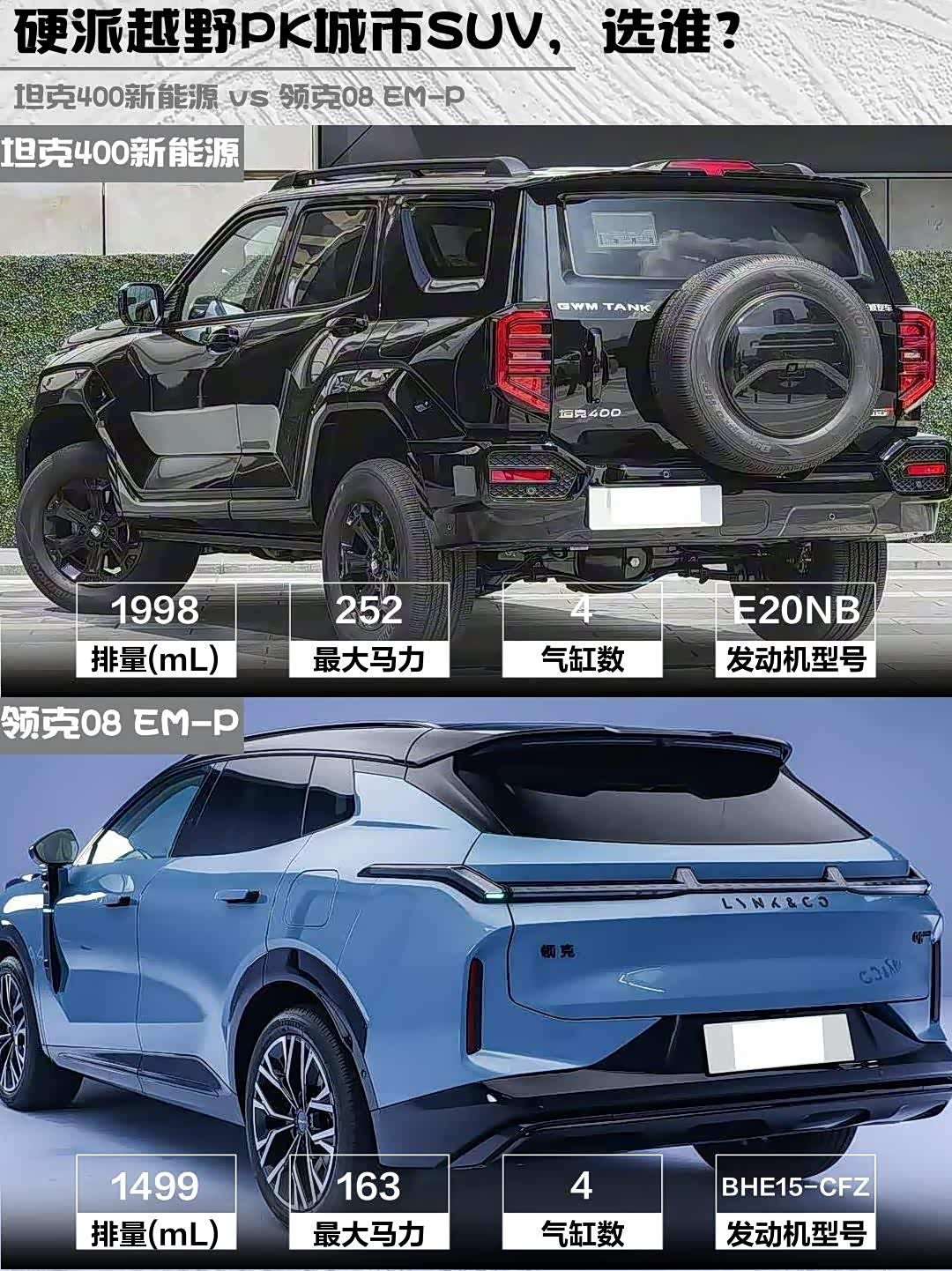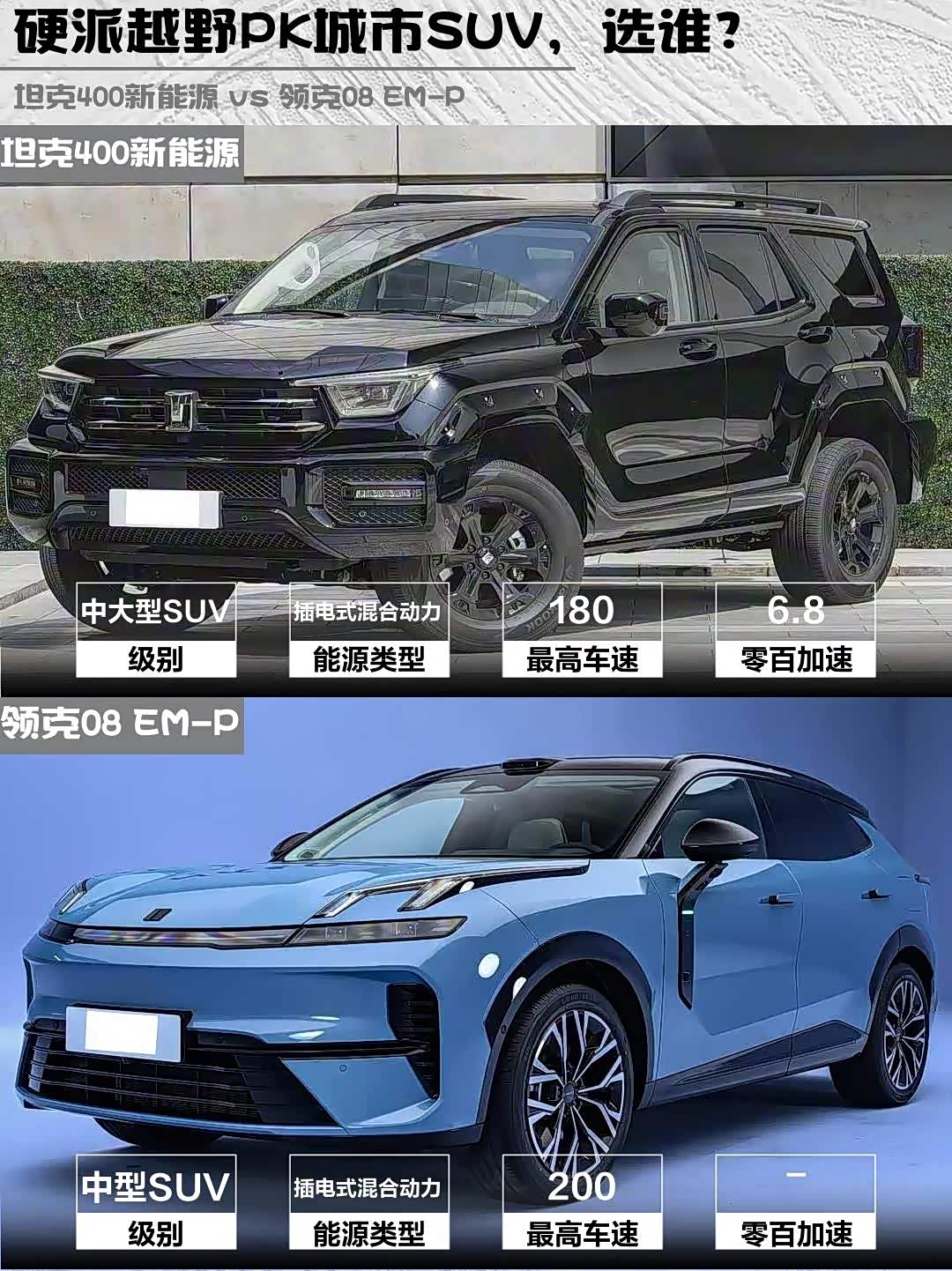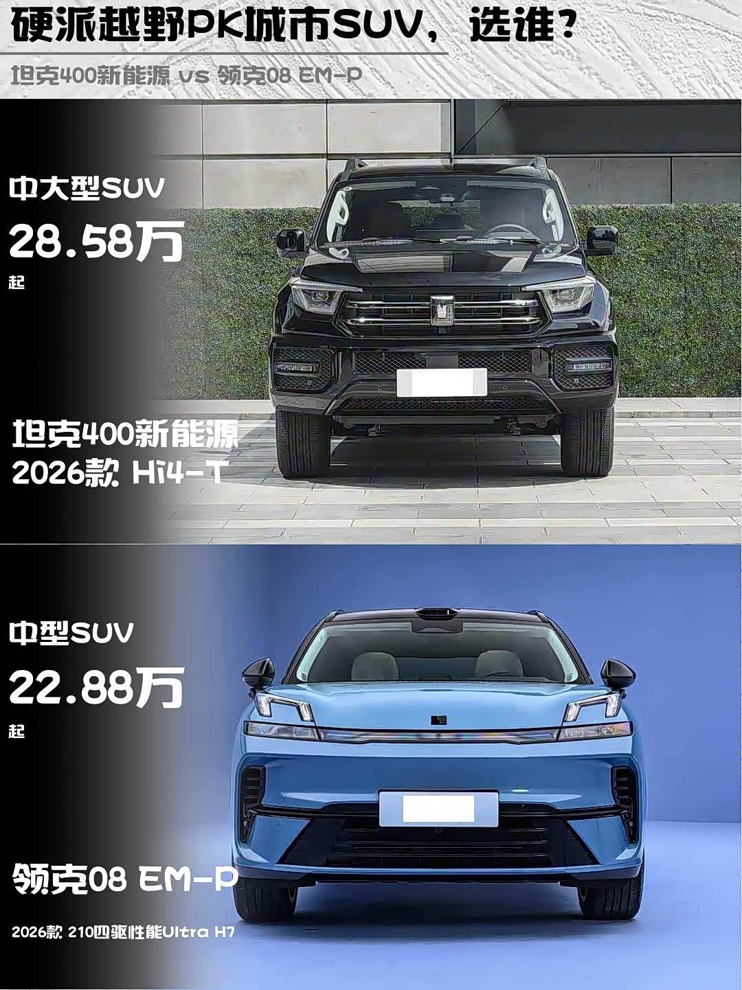 最近深度试驾了坦克400新能源 2026款 Hi4-T和 领克08 EM-P(参数|询价) 2026款 210四驱性能Ultra H7两款热门新能源SUV,作为30万级插混市场的代表车型,它们各自的特点太鲜明了!分享一下真实对比感受,给纠结的小伙伴参考👇