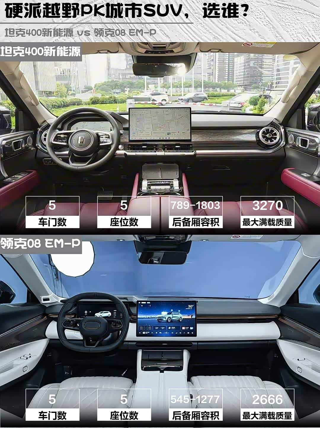 领克08 EM-P的Flyme Auto车机完胜!15.4英寸屏操作跟手机一样顺滑,AR-HUD导航超酷。坦克400新能源的15.6英寸屏反应慢半拍,语音控制差速锁经常识别错误。不过坦克的实体越野按键盲操更方便,领克的全触控在越野时容易误触。