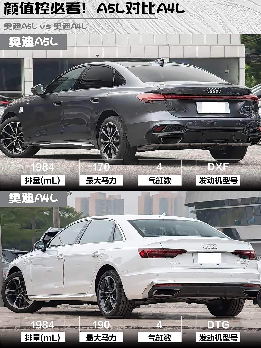 虽然都是2.0T+7DCT,但A5L的第五代EA888发动机热效率更高,WLTC油耗6.72L比A4L省0.18L。实际开起来A5L方向盘更轻巧,运动模式声浪更带感!不过A4L的190马力比A5L多20匹,8.3秒破百略快0.2秒(但谁天天崩01啊)
