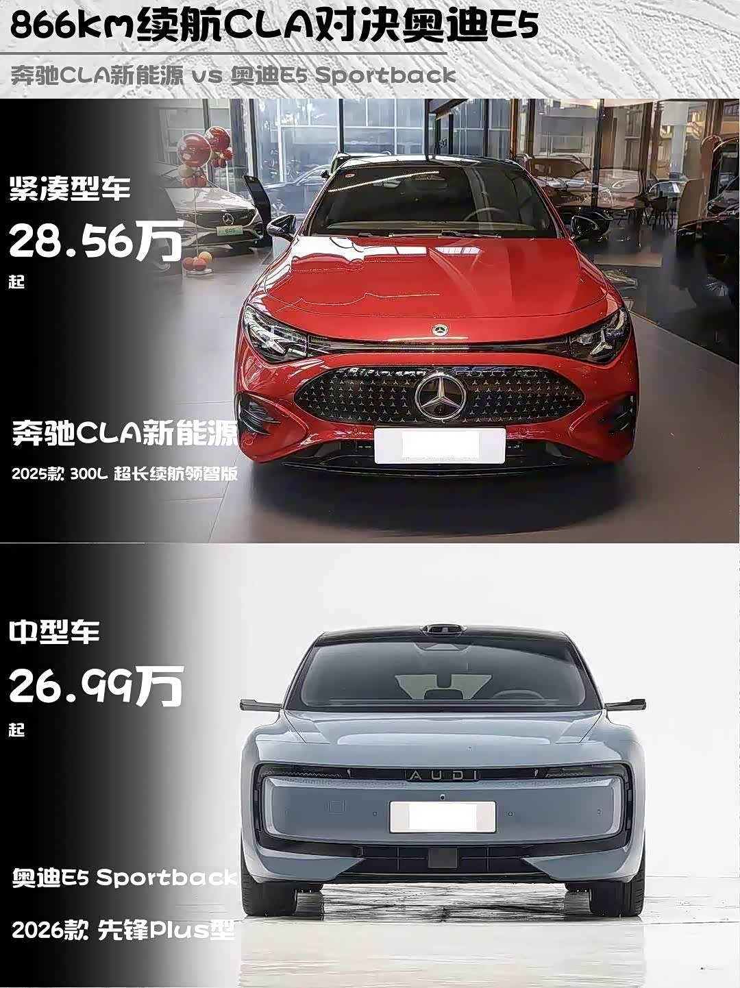 最近后台被问爆的对比来了!奔驰CLA新能源2025款 300L超长续航领智版(28.56万)和奥迪E5 Sportback 2026款先锋Plus型(26.99万),这两台德系纯电轿跑到底怎么选?实测干货直接上!👇